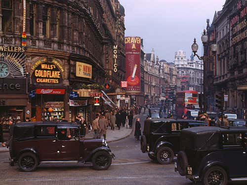 This photo shows the view along Shaftesbury Avenue from Piccadilly Circus, London, in 1949.