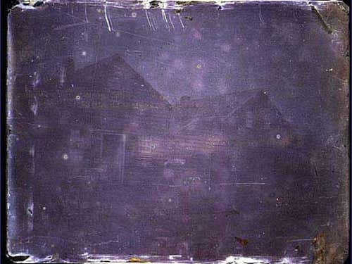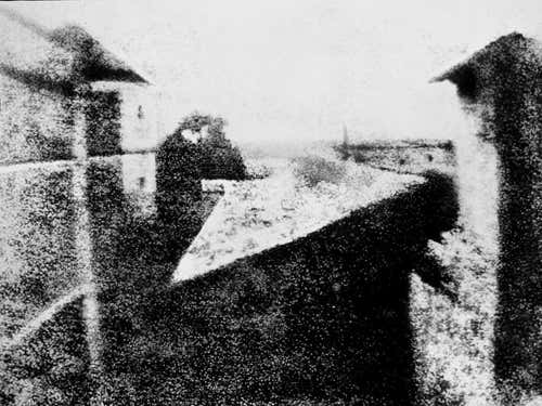 The French inventor Joseph Nicéphore Niépce created the first permanent photographic image in 1822. He coated a sheet of glass with bitumen, which hardens in sunlight. After placing the sheet inside a camera obscura and exposing it for 8 hours, he washed away the soft, unexposed bitumen with lavender oil, leaving a permanent image. The picture here, The View from the Window at Le Gras, is the oldest surviving example of the technique and dates from 1826.