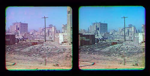 This stereoscopic image is the earliest known colour photograph of San Francisco, taken in the aftermath of the 1906 earthquake.