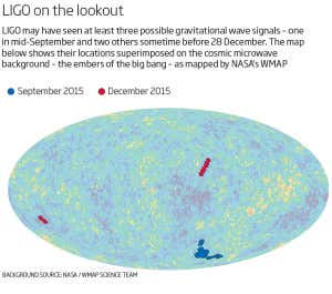 Two other searches – one around the constellation Aries, the other in the rough vicinity of Hydra – both began on 28 December and continued until the end of the run on 14 January (see red spots on map). The three searches together suggest LIGO may have been unbelievably lucky.