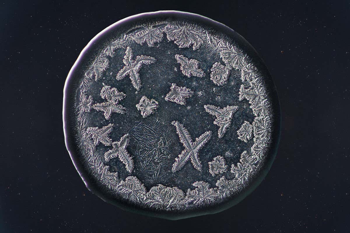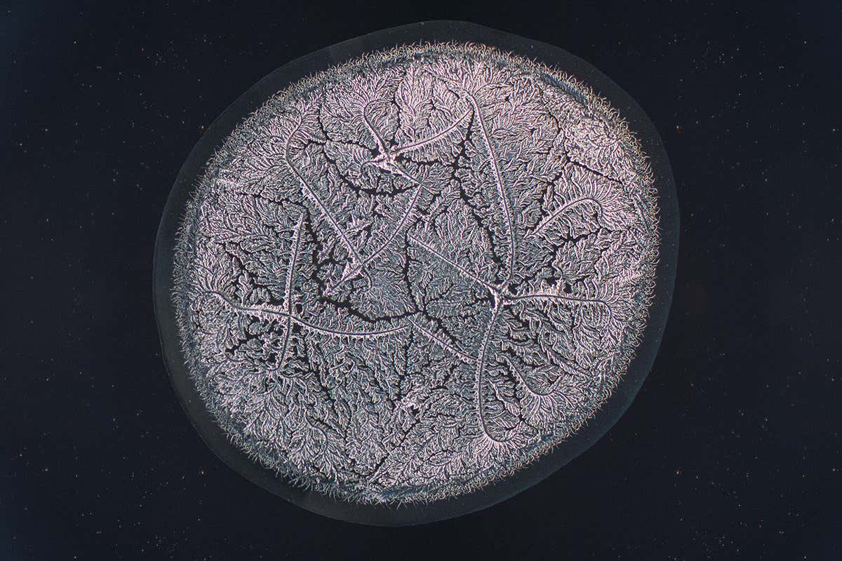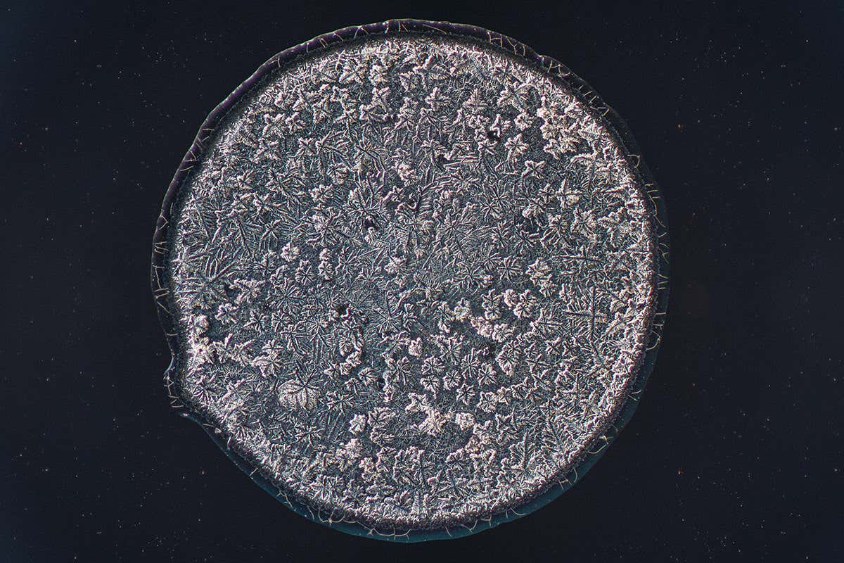 Each disc is a tear droplet that has been pipetted onto a glass slide, allowed to evaporate and photographed using dark field microscopy. The delicate white structures are the crystallised salts left behind from the briny fluid. As well as salts, tears contain antibodies and other proteins that combat infections and help protect the eye.