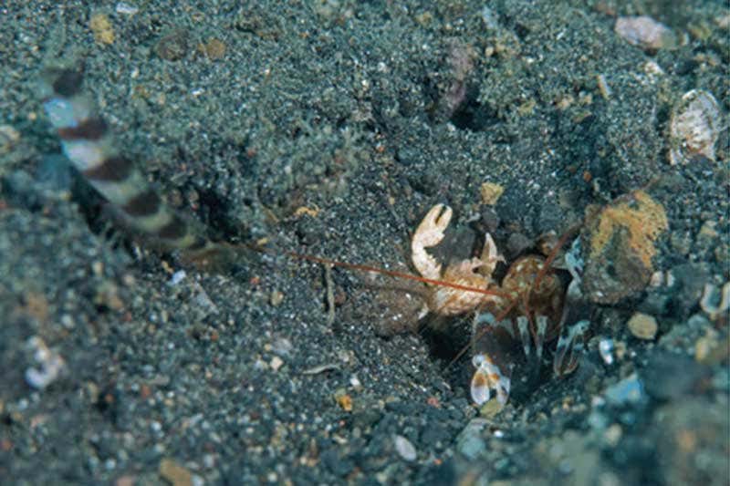 They found six instances of porcelain crabs sharing burrows with pistol shrimp and gobies near a reef in Lembeh Strait, Indonesia. The animals typically exit the burrow together, in a chain – with the crab’s claw and antennae touching the shrimp’s body and the shrimp’s antennae nearly glued to the fish’s tail.