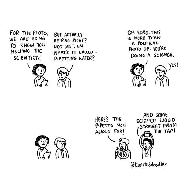 Twisteddoodles gets a photo op with scientists By Twisteddoodles 14 July 2021 Facebook / Meta Twitter / X icon Linkedin Reddit Email Other cartoons by Twisteddoodles can be found here Topics:Cartoon Advertisement Sign up to our weekly newsletter Receive a weekly dose of discovery in your inbox. We'll also keep you up to date with New Scientist events and special offers. Sign up