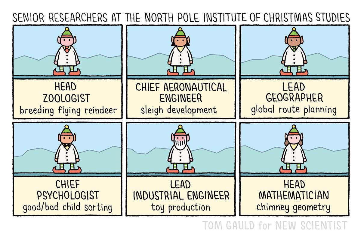 Tom Gauld visits elf researchers at Santa’s North Pole Institute By Tom Gauld 8 December 2021 Facebook / Meta Twitter / X icon Linkedin Reddit Email Other cartoons by Tom Gauld can be found here. Topics:Cartoon Advertisement Sign up to our weekly newsletter Receive a weekly dose of discovery in your inbox. We'll also keep you up to date with New Scientist events and special offers. Sign up