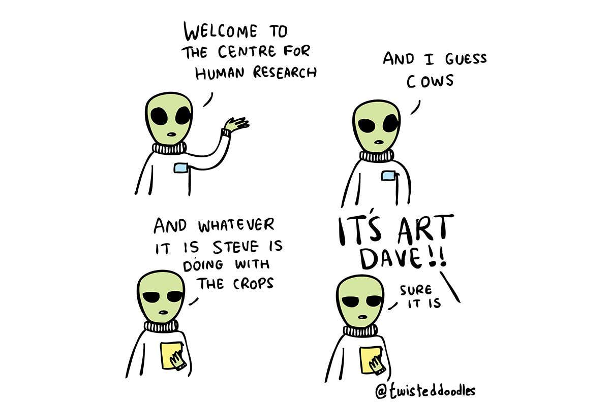 Twisteddoodles: Welcome to the Centre for Human Research By Twisteddoodles 29 December 2021 Facebook / Meta Twitter / X icon Linkedin Reddit Email Other cartoons by Twisteddoodles can be found here Topics:Cartoon Advertisement Sign up to our weekly newsletter Receive a weekly dose of discovery in your inbox. We'll also keep you up to date with New Scientist events and special offers. Sign up