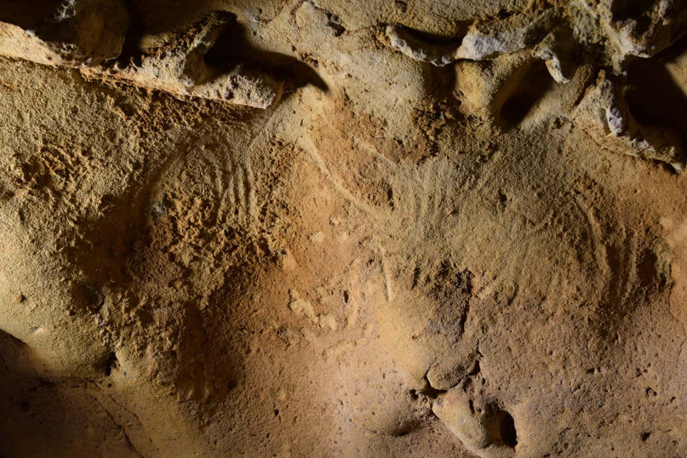 The walls of the third chamber, called the pillar chamber, are made of tuff, a soft rock primarily formed from solidified volcanic ash. Here, the team found eight panels covered with markings. These include a great many lines traced by fingers: often straight lines, but sometimes also circles or ovals. Some seem to be arranged in larger patterns. One panel has a cluster of more than 100 dots. A subgroup of the engravings was made with tools like flint, antler and wood rather than with fingertips.