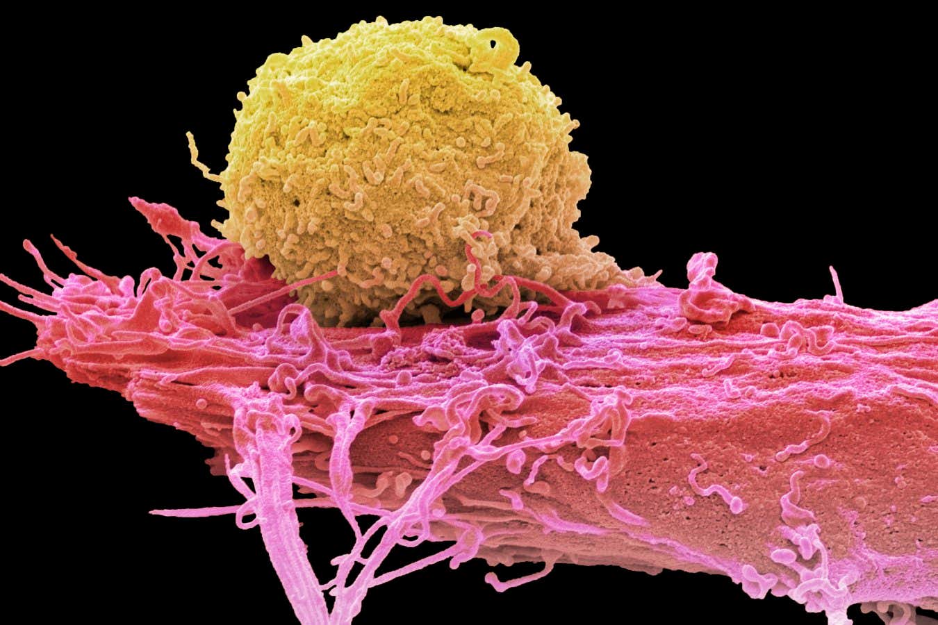 A CAR T-cell (yellow) and a brain cancer cell (pink) viewed with an electron microscope STEVE GSCHMEISSNER/SCIENCE PHOTO LIBRARY