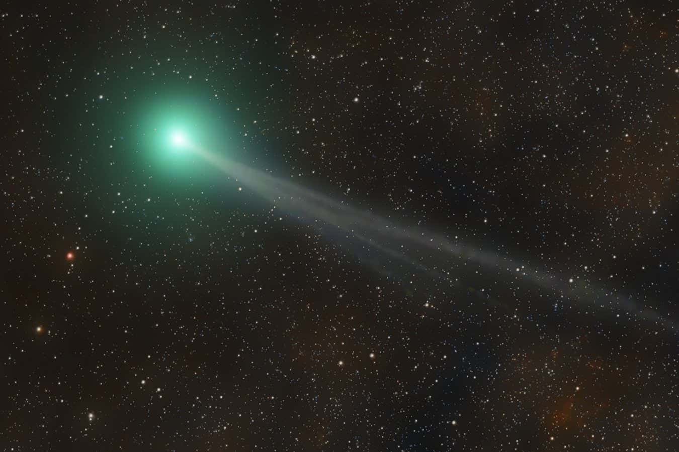 The comet appears green because its coma, the gas surrounding the nucleus, contains a relatively rare kind of carbon gas called diatomic carbon, which consists of two carbon atoms bound together.
