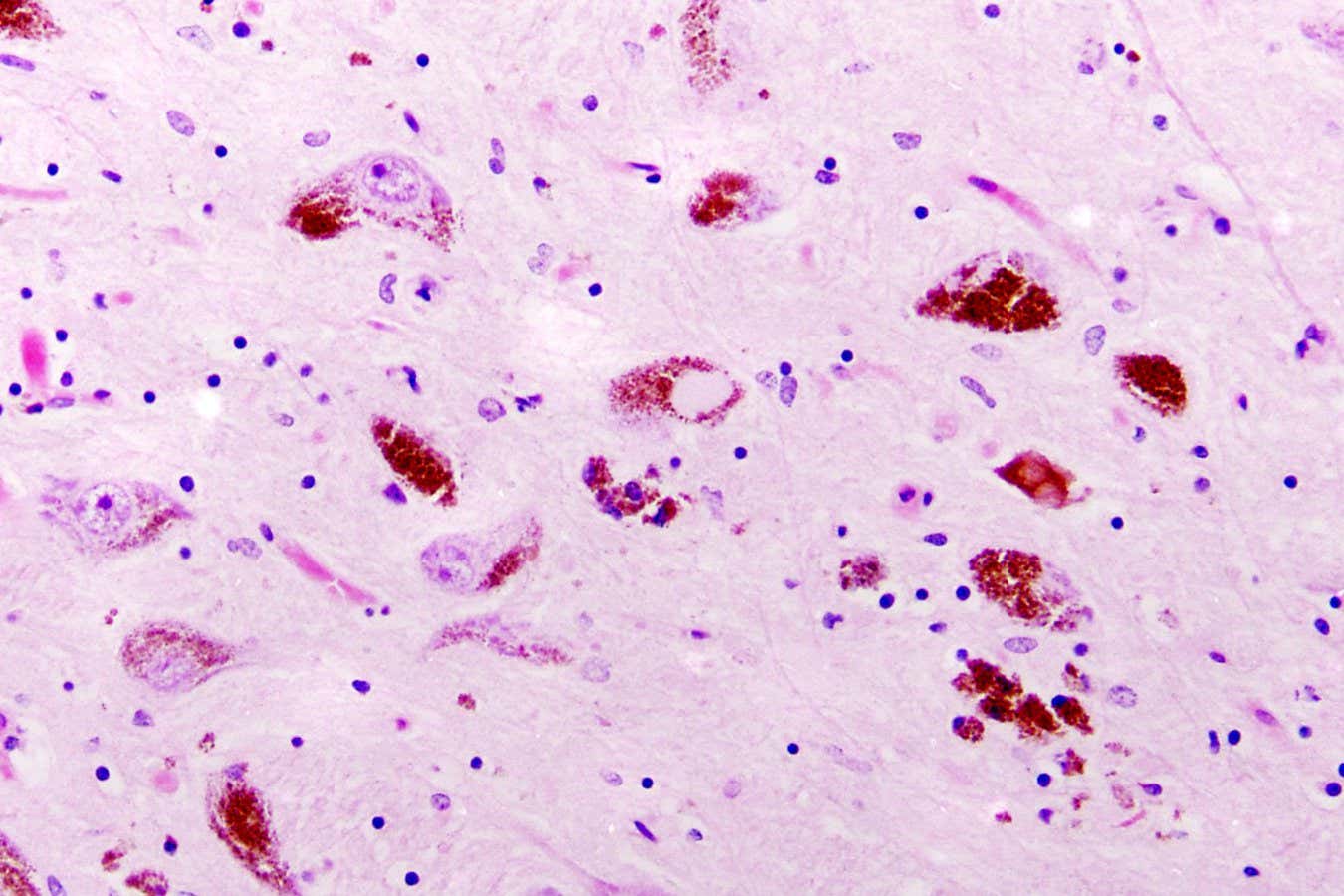 A sample of brain tissue from a person with Parkinson’s disease, showing clumps of protein known as Lewy bodies (red) Cultura Creative Ltd / Alamy