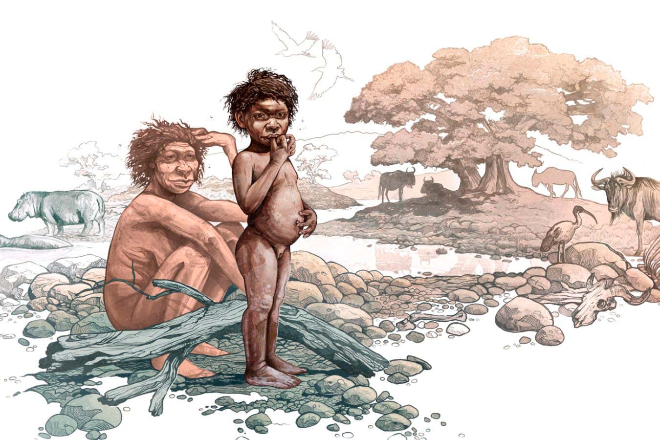 Illustration of a Homo erectus child with her mother in the Ethiopian highlands Diego Rodriguez Robredo