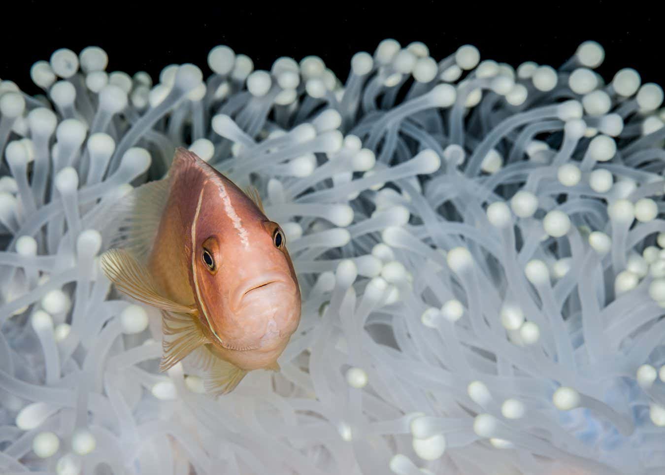 The runner-up, Daniel Shipp, took this photo of a pink skunk clownfish (Amphiprion perideraion) near the island of Bunaken off Sulawesi, Indonesia. The fish is sheltered by the tentacles of a long-tentacle anemone (Macrodactyla doreensis) that has undergone bleaching. Similar to corals, sea anemones have a symbiotic relationship with the photosynthetic algae that live in their tissues. High temperatures can cause the algae to leave, and this can lead to the death of the anemone if adverse conditions persist.