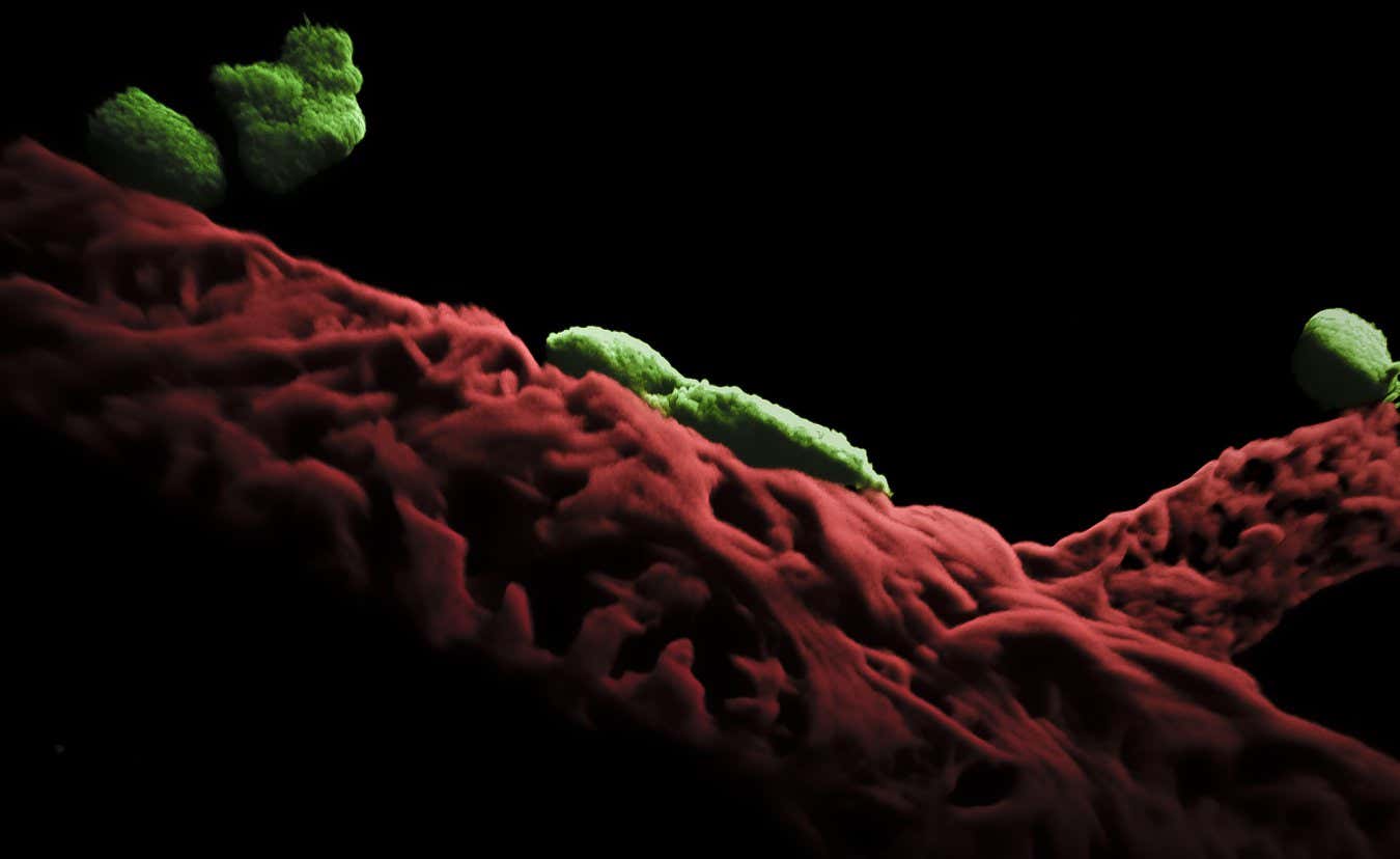 An image from Loïc Rolas, also at Queen Mary University of London, looks at the outside of a mouse’s blood vessel, represented by the deep red structure at the bottom of the image. The green bodies on top of the blood vessel are mast cells – immune cells that control blood flow and inflammation.