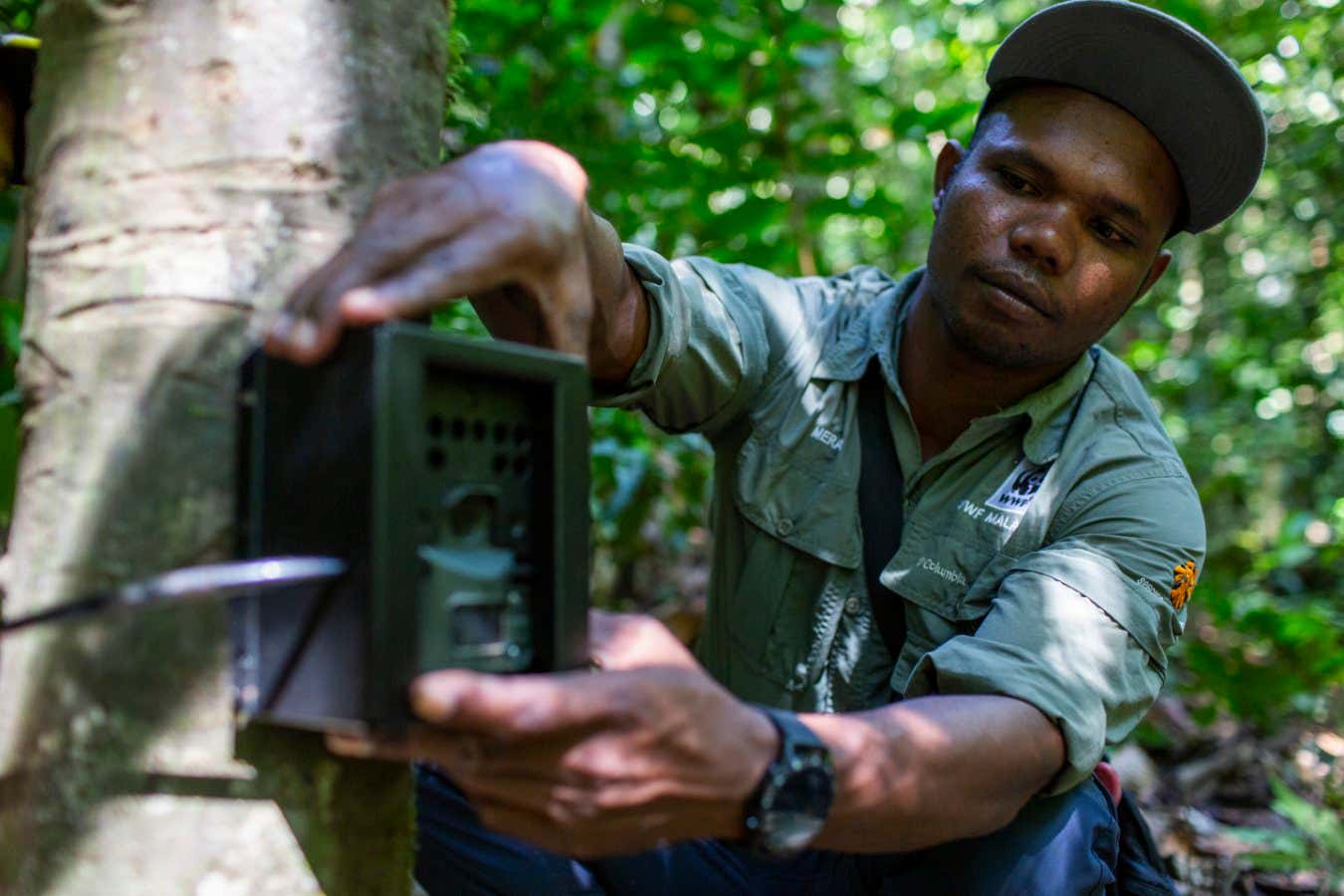 Merapi Mat Razi, a member of the Project Stampede team, setting up a camera trap Emmanuel Rondeau/WWF-US
