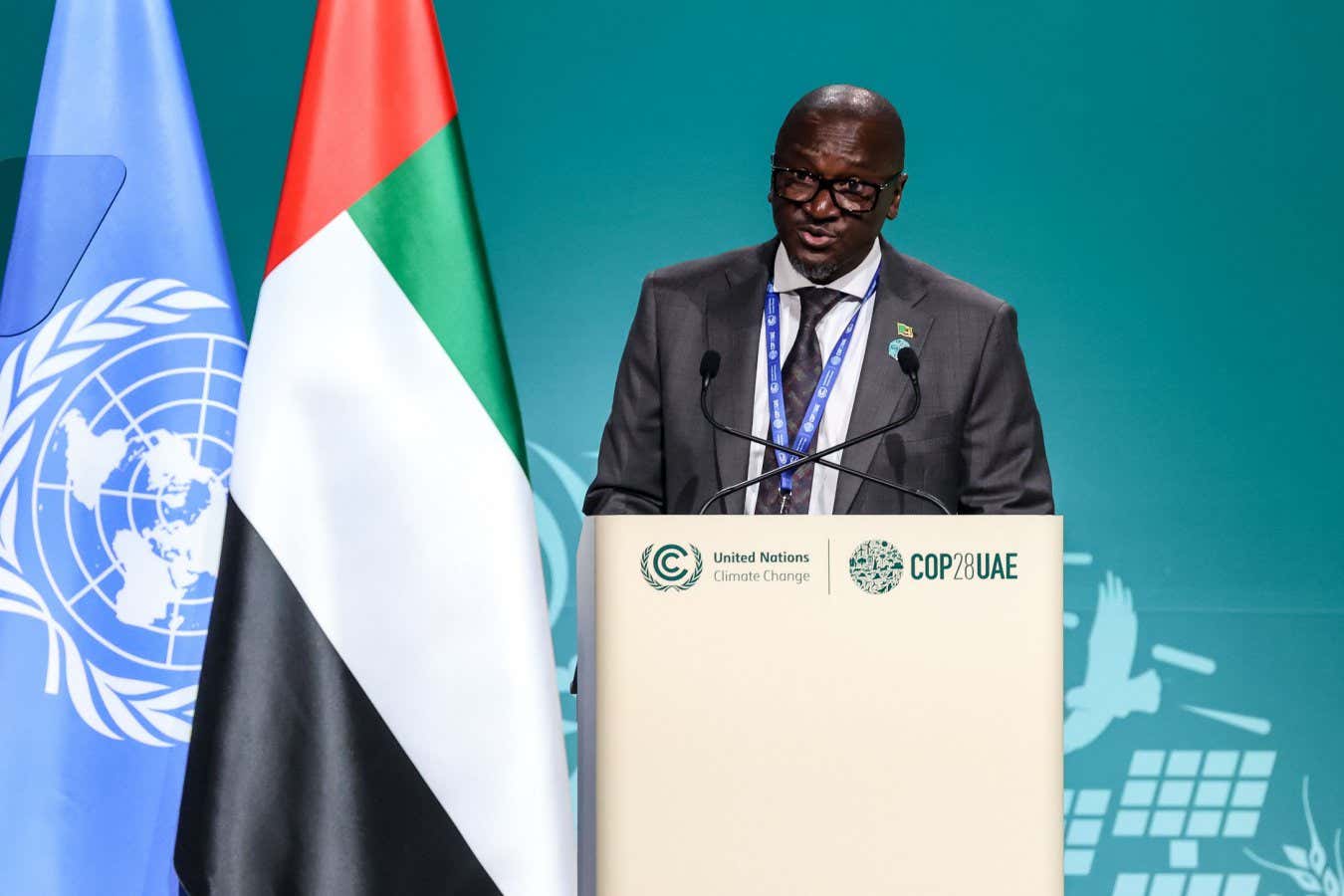 Collins Nzovu, Zambia’s minister of green economy and environment, speaking at COP28 Dominika Zarzycka/NurPhoto/Shutterstock