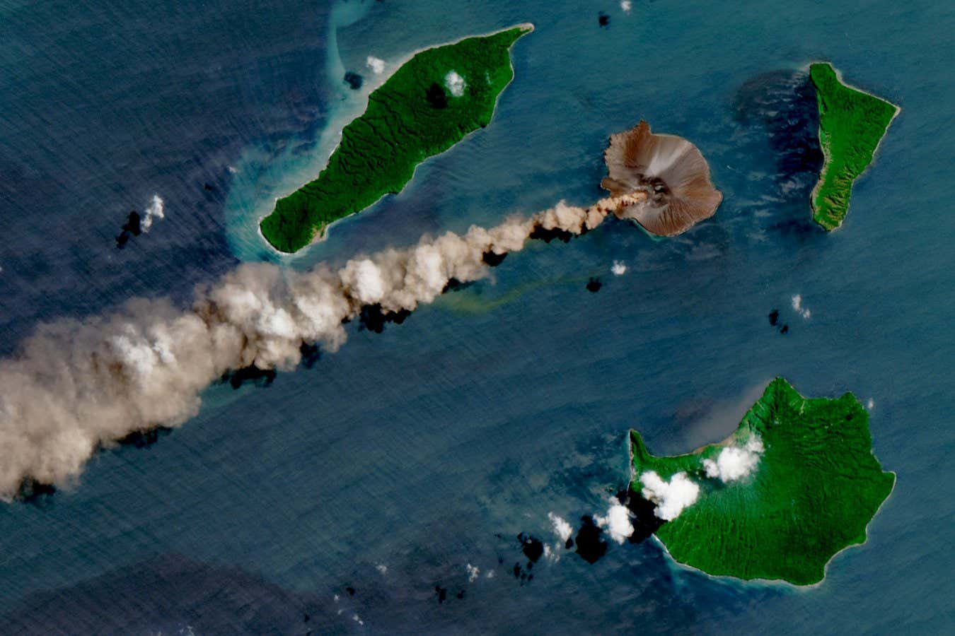 Plumes of white and brown ash stream from Indonesia’s infamous Krakatoa volcano in a striking aerial view captured by the Sentinel-2 satellite on 12 May. Krakatoa started another eruption cycle in September, marked by intensifying volcanic activity.