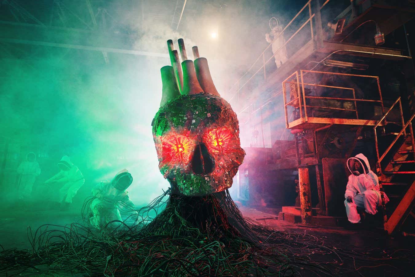 Skull of Satoshi, a sculpture by Benjamin Von Wong highlighting the environmental impact of bitcoin VonWong/Skull Of Satoshi/Greenpeace blog.vonwong.com/skull/