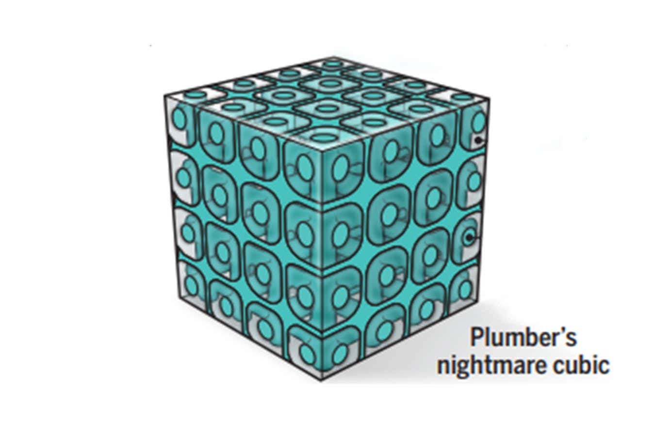 Plumber’s nightmare consists of a pattern of six intersecting tubes, meaning that a sample contains many tubes connecting and intersecting in complex ways. The material was first theorised 20 years ago and has previously been made from soap-like molecules in water, but never from a solid material.