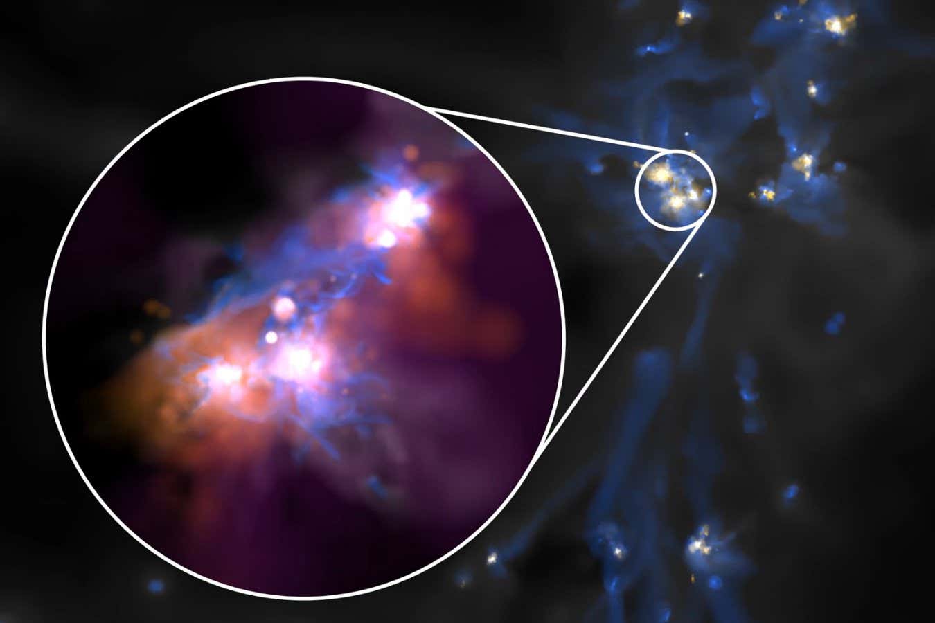 Merging galaxies create bursts of star formation and light, including Lyman-alpha emission. They also generate powerful winds that could blow away the galaxies’ cosmic gas, allowing the light to escape. Those winds and the energy from the star formation could also strip the gas atoms of their electrons, which would otherwise allow it to absorb the light, rendering it transparent.