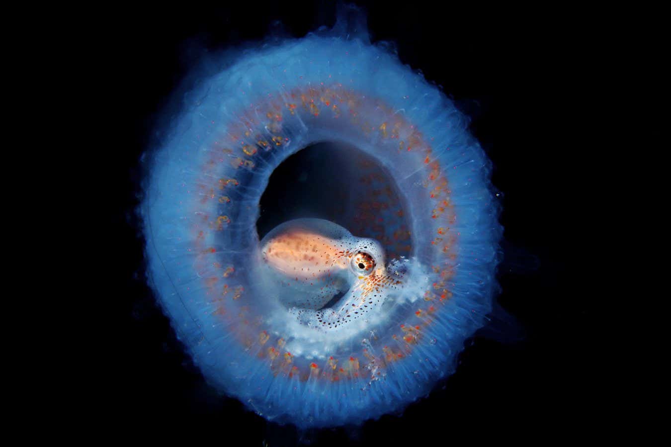 In stark contrast to the gigantic grey whale, this 10-centimetre-wide organism was captured up close in deep waters off the Philippines. The circular subject of the image is a pyrosome – a colonial animal that is made up of hundreds or thousands of minuscule individuals called zooids. Enveloped inside the bizarre pyrosome is a little octopus, just peeking out.