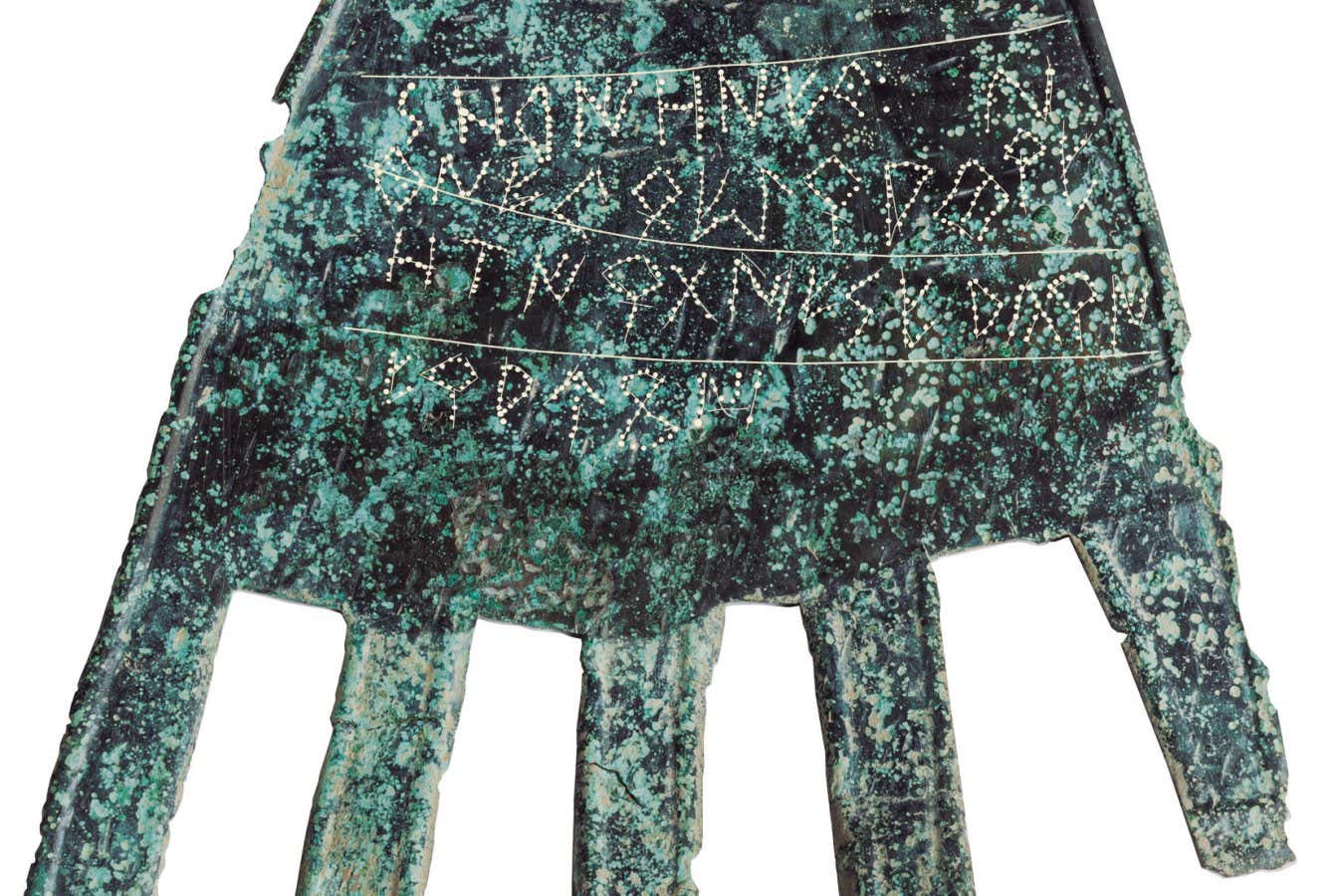 The Irulegi hand is a sheet of bronze 14 centimetres long, 12.8 cm wide and just 0.1 cm thick, with a greenish patina. On the back of the hand are four lines of text, which were first scratched in and then re-written by punching dots into the metal.