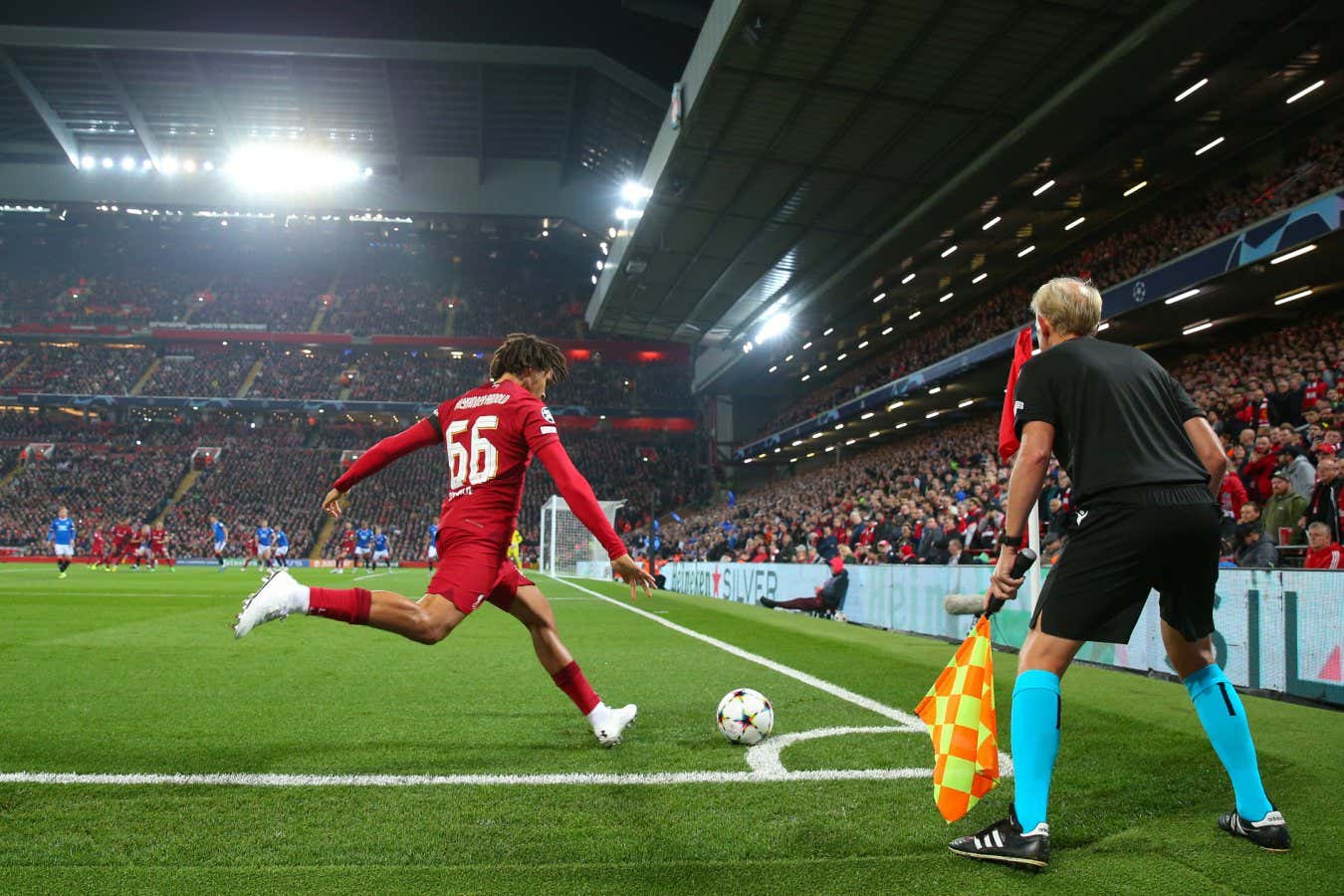Corner kicks, like this one taken by Trent Alexander-Arnold for Liverpool, can lead to goal-scoring opportunities Robbie Jay Barratt/ AMA/Getty