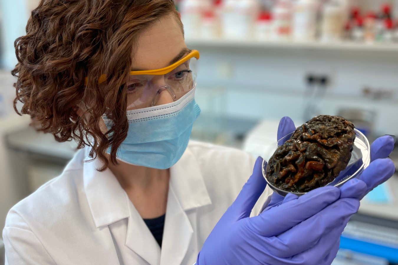 Alexandra Morton-Hayward holding a 1000-year-old preserved brain Graham Poulter