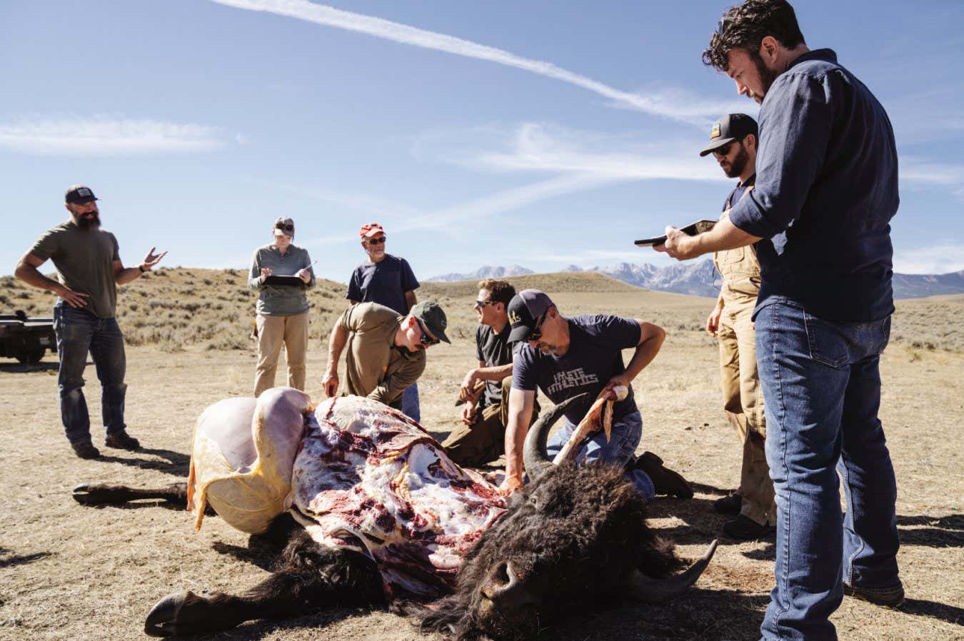 Field processors butcher the bison with stone tools, while recorders take notes on how they use them Seth Morris