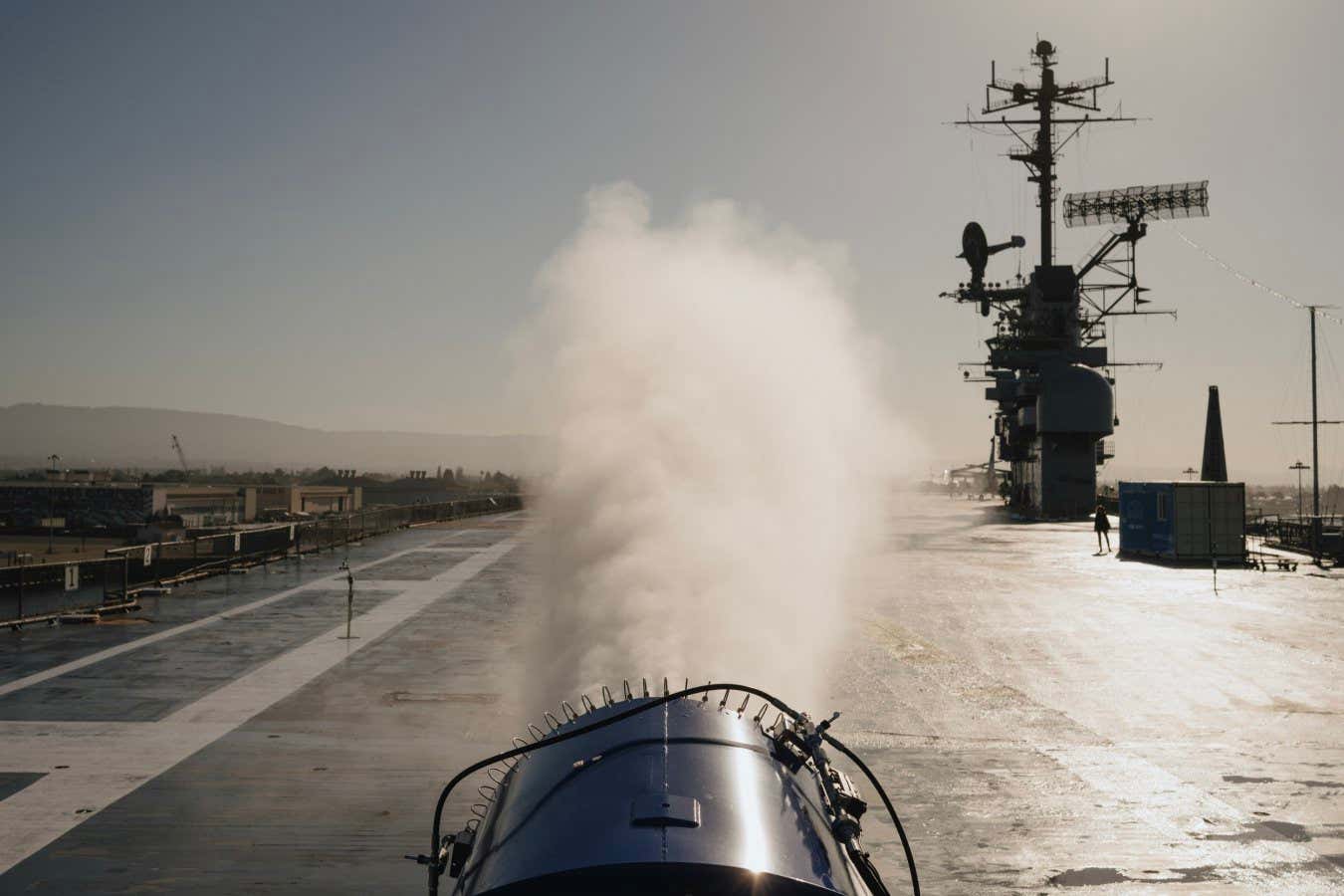 A machine sprays sea salt particles from the flight deck of a decommissioned aircraft carrier in California to test a technique to make clouds brighter New York Times/Redux/eyevine