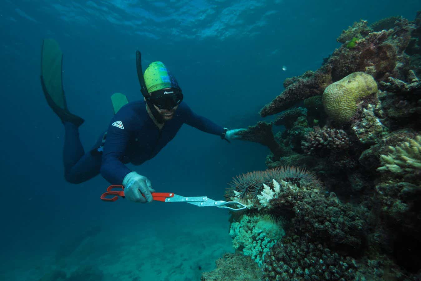 During a major reef-wide eruption of the starfish between 2012 and 2022, the Great Barrier Reef Marine Park Authority carried out a large-scale culling programme. Teams of divers inject the starfish with a single shot of either vinegar or ox bile, which kills them and prevents the release of larvae.