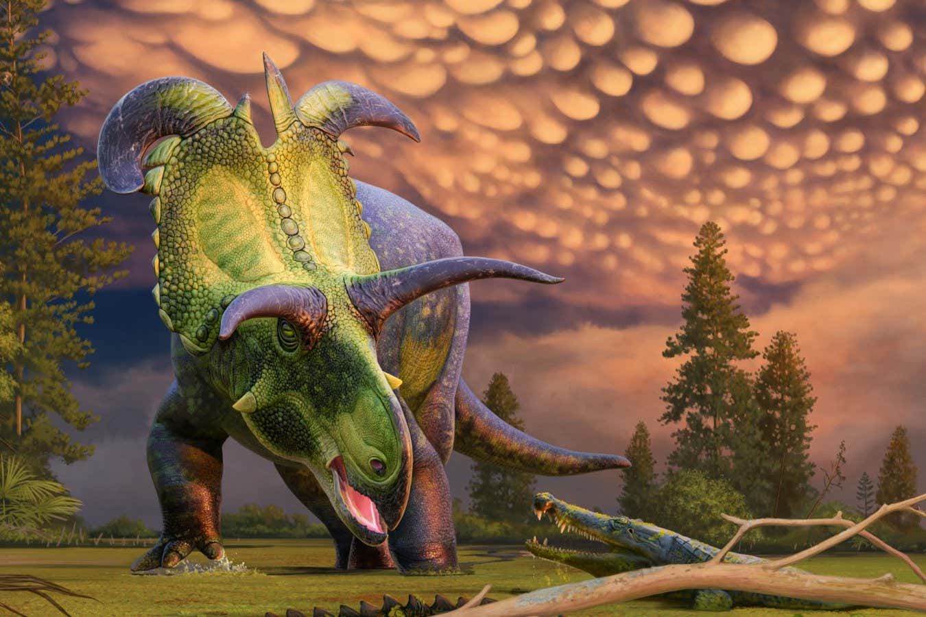 Artist’s impression of Lokiceratops encountering a crocodilian in the 78-million-year-old swamps of northern Montana ©Andrey Atuchin for the Museum of Evolution in Maribo, Denmark.