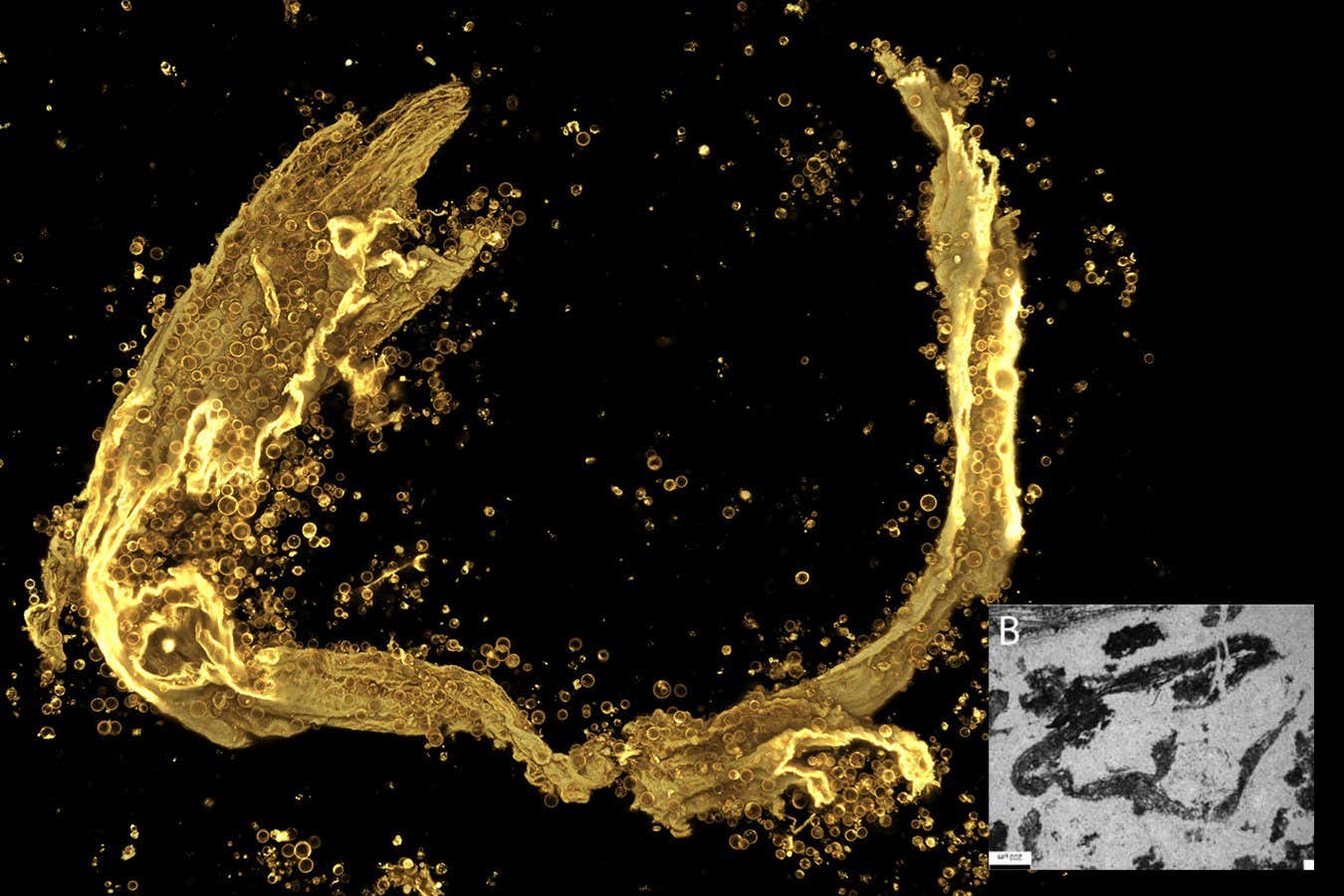 Unusual cells without walls can create structures (main image) that resemble those found in 3.4-billion-year-old rocks from Buck Reef, South Africa (inset) Dheeraj Kanaparthi et al. (2024); Tice et al., (2009)