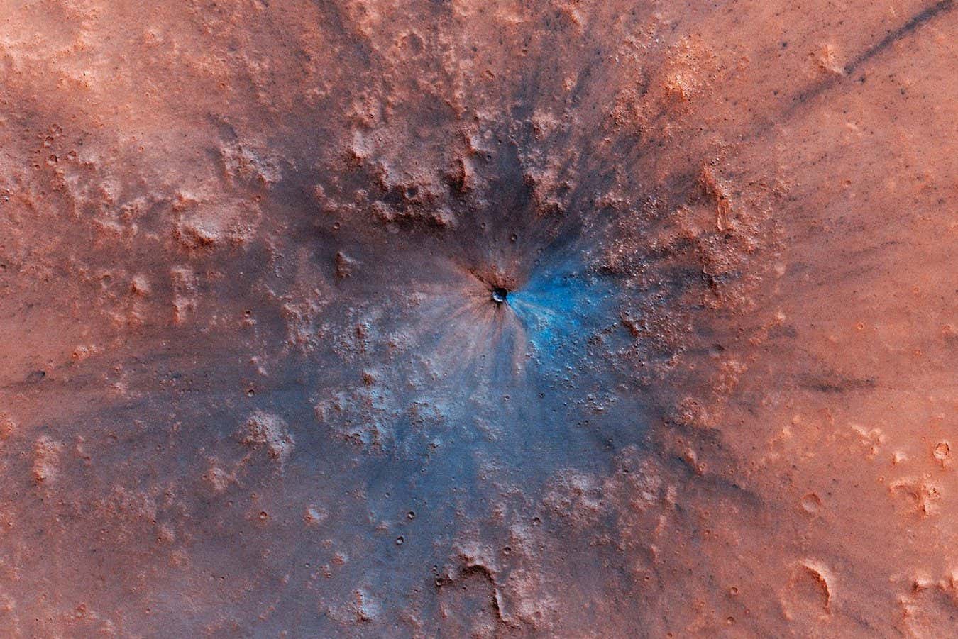 An impact crater on Mars, with darker material exposed beneath the reddish dust NASA/JPL-Caltech/University of Arizona