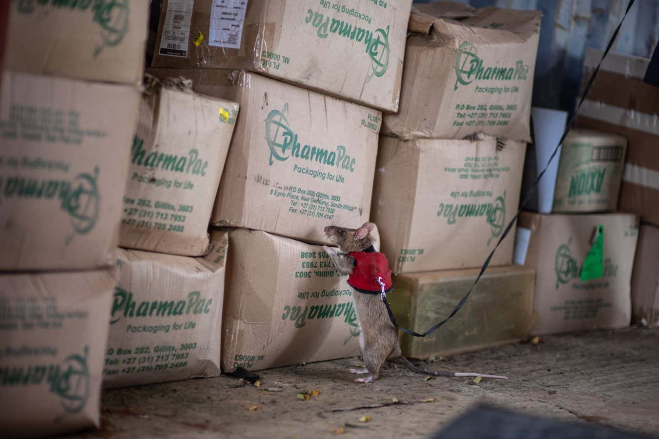 An African giant pouched rat sniffs boxes looking for wildlife products APOPO