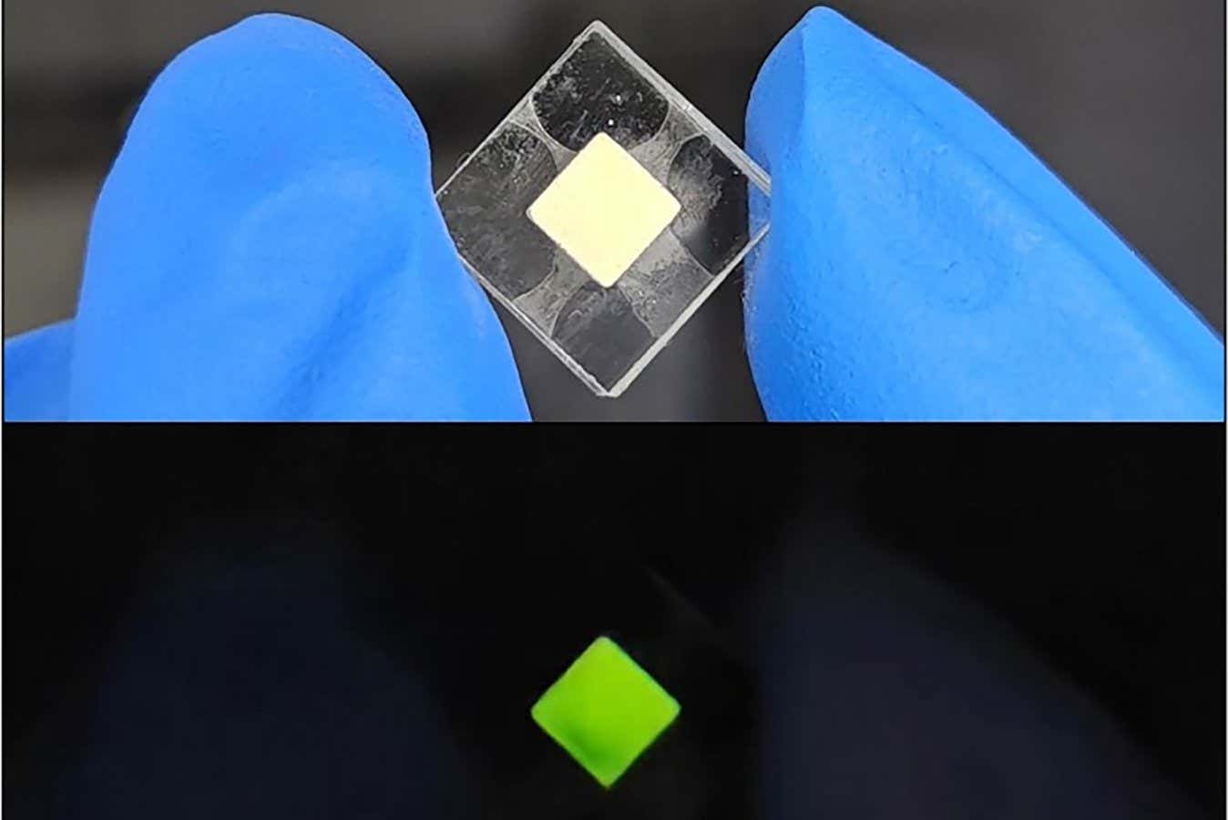 The glowing americium-doped crystal with a light source (top) and in a dark environment (bottom) Kai Li et al.