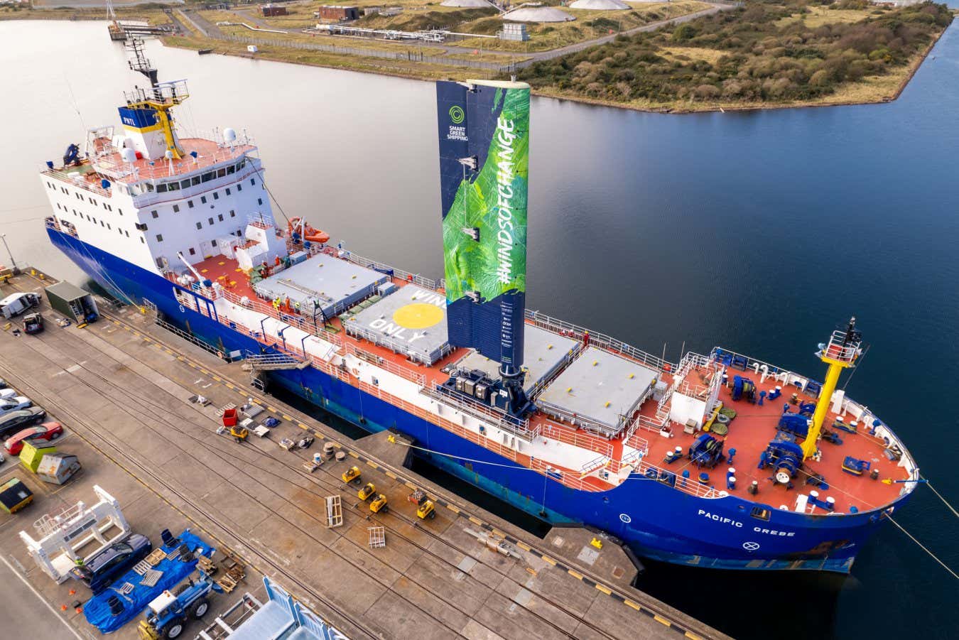 The Pacific Grebe is spending three weeks in October travelling around the coast of the UK testing the FastRig, a 20-metre-tall sail designed to help propel large tankers across the high seas.