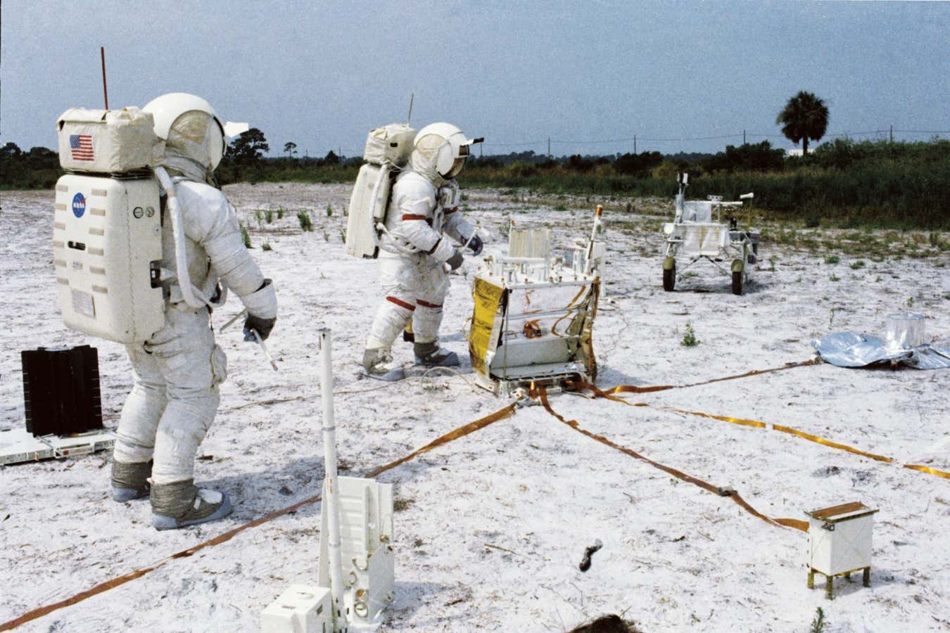 Edgar Mitchell, left, and Alan Shepard participate in lunar surface simulation training at the Kennedy Space Center, July 1970 NASA/JSC