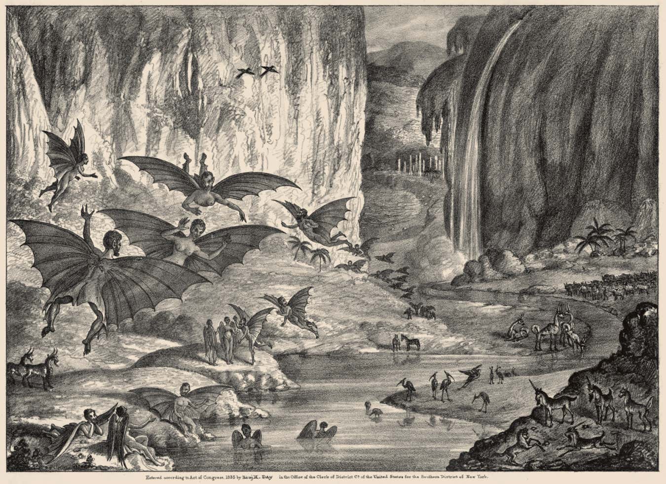 The Great Moon Hoax (1835) published by The Sun depicts a lunar valley and bat-like flying creatures with human features Library of Congress Prints and Photographs Division Washington, D.C.