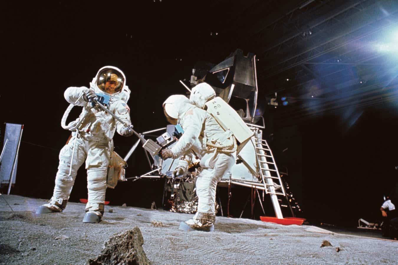 Buzz Aldrin (left) and Neil Armstrong practice using geology tools while wearing their spacewalk suits during a training exercise at the NASA Johnson Space Center in Houston, Texas NASA/JSC