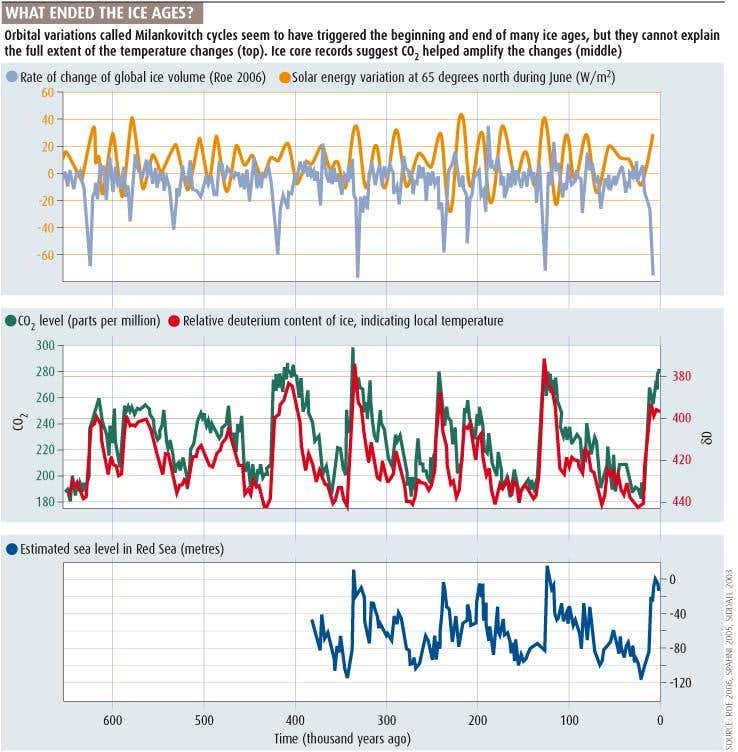 What seems to have happened at the end of the recent ice ages is that some factor – most probably orbital changes – caused a rise in temperature. This led to an increase in CO2, resulting in further warming that caused more CO2 to be released and so on: a positive feedback that amplified a small change in temperature. At some point, the shrinking of the ice sheets further amplified the warming.