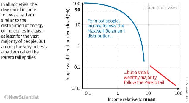 More than 100 years ago, physicists pointed out that the broad income curve for the majority resembles the distribution of energy among molecules in a gas, a pattern called the Maxwell-Boltzmann distribution. This prompted the idea that the distribution arises because people exchange wealth when they meet, much as gas molecules exchange energy when they collide.