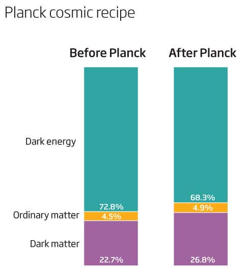 Planck’s results also adjust the relative proportions of ordinary matter and the mysterious dark matter and dark energy thought to make up the bulk of the cosmos – the universe has slightly more matter and dark matter and slightly less dark energy than we thought (see graph). “There is less stuff that we don’t understand, by a tiny amount,” said Efstathiou.