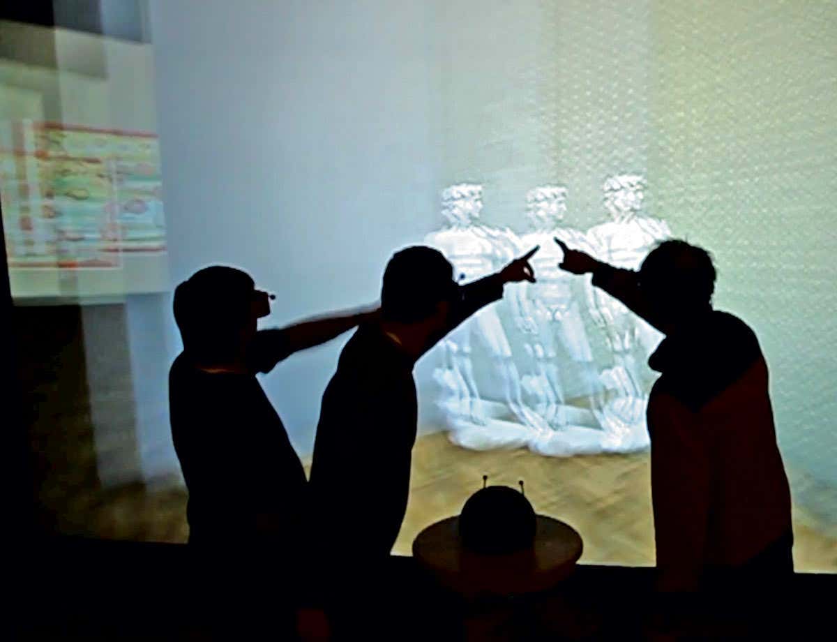 In a demo of the system, six participants inspect a full-size projection of Michelangelo’s David. Each only sees the perspective that is appropriate to their location, so if they move from left to right, their view of David‘s profile changes, as if they were walking around the real statue. They can also see each other and interact with the display together, by pointing to it or by manipulating the virtual objects and environment using a tabletop trackpad.