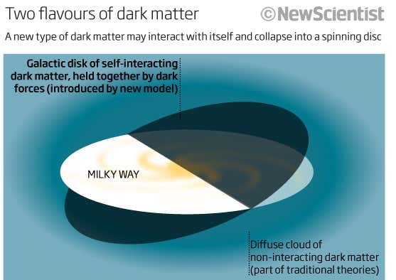 If her model is correct, the consequences would be pretty interesting. Observations of the orbits of stars around galaxies suggest that all galaxies, including the Milky Way, are surrounded by a spherical cloud of dark matter (see diagram). But if a fraction of dark matter particles interact with each other, they would combine into atom-like structures and eventually collapse into a spinning disc. This is how ordinary matter formed the Milky Way. The resulting shadow Milky Way could be spinning right along with the visible one, or it could end up tilted at a slight angle, she adds. Randall is also open to the idea of more particles, just as normal matter consists of a slew of subatomic entities, including quarks, electrons and neutrinos.