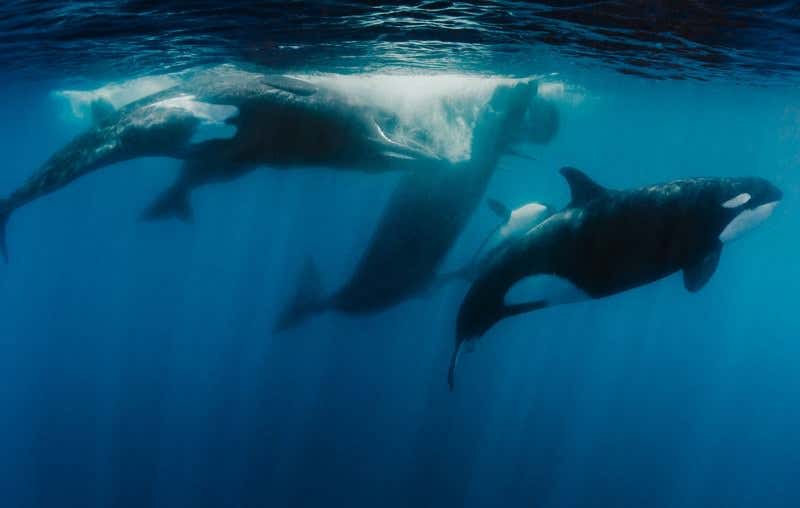 These underwater images were captured by Shawn Heinrichs after he leaped from a boat into the heart of the action. “I realised this was a once-in-a-life time opportunity and summoned up the courage to jump in the water and join the frenzy,” he says.