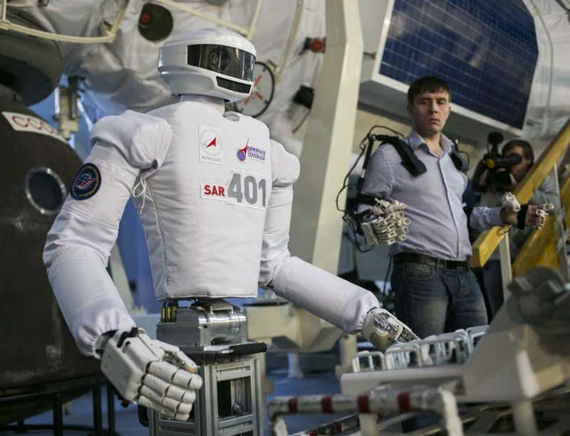 In this picture, that’s the super-focussed guy in the background but in space it would be a cosmonaut operating from the relative safety of the station’s interior and so avoiding a risky spacewalk. You can watch the Russian android mirroring a human here.