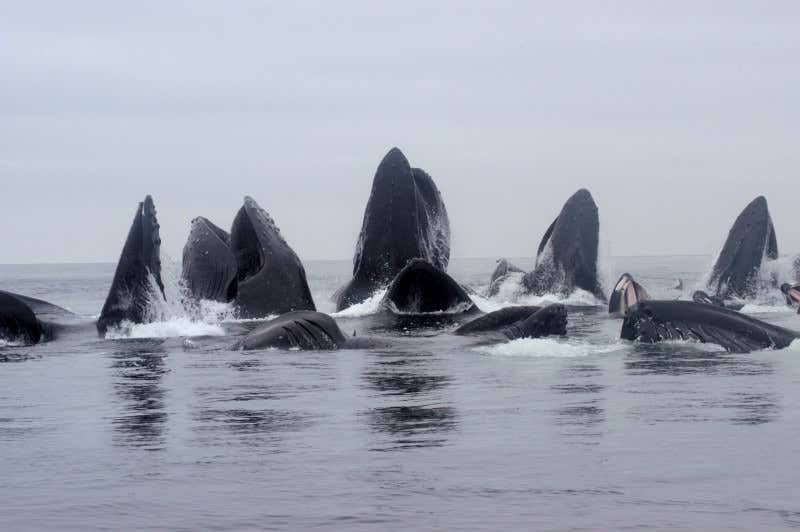 They look like a crop of boulders protruding from the sea, but these dark shapes are the noses of humpback whales caught in a feeding frenzy.