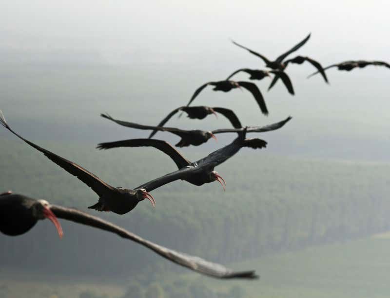 As they migrate south, these northern bald ibises carefully position themselves in the V formation and flap their wings at precise times. As a result, each bird finds it easier to stay aloft, saving energy for the whole flock.