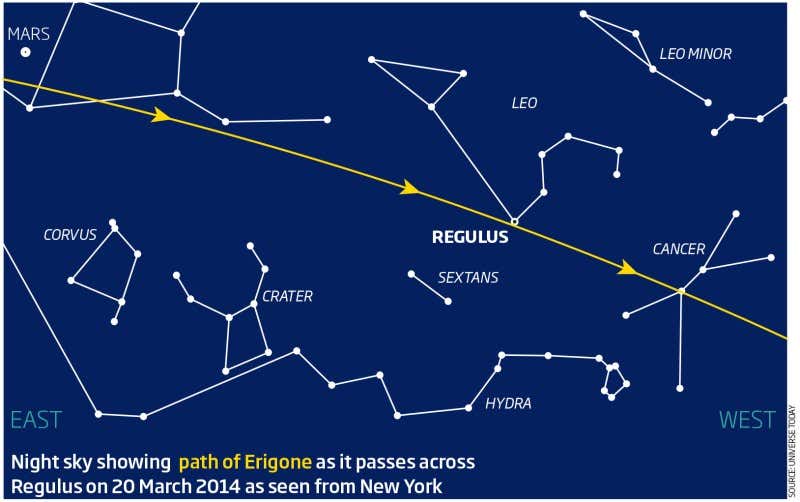 New Yorkers don’t need to panic: the 72-kilometre-wide asteroid Erigone isn’t going to smash into the city. Instead, it is scheduled to eclipse Regulus – the brightest star in the constellation Leo – as seen from the Big Apple, plus a large part of upstate New York and parts of New Jersey, Connecticut, Ontario and Bermuda.