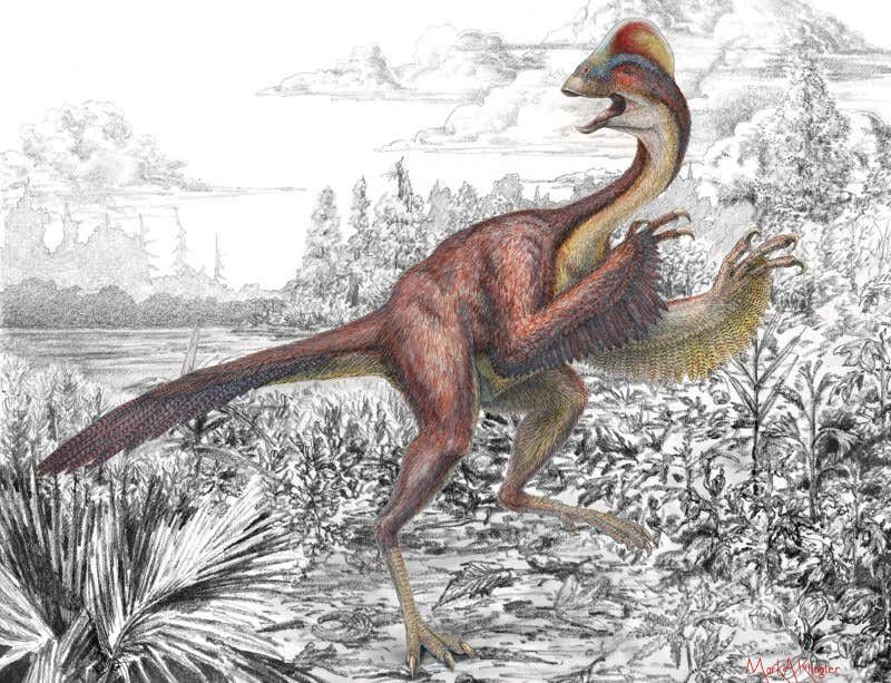 Anzu belongs to the oviraptorosaurs, which ranged in size from the height of a chicken to the height of monsters like Gigantoraptor, which stood twice as tall as a person. Anzu is similarly gigantic: it would have been about 1.5 metres high at the hip, and 3.5 metres long from tail to beak. It is named after a rebellious demon from ancient Mesopotamian mythology who took the form of a huge bird with a lion’s head.