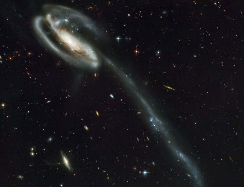 The tadpole and other galaxies like it might help to explain an outstanding mystery about our own galaxy, the Milky Way. Cosmology predicts there should be thousands of dwarf galaxies sprinkled randomly all around it. Yet observations show that just 26 dwarf galaxy companions orbit the Milky Way in a thin disc. Collisions like this one in our galaxy’s distant past might be an alternative mechanism that explains the discrepancies.